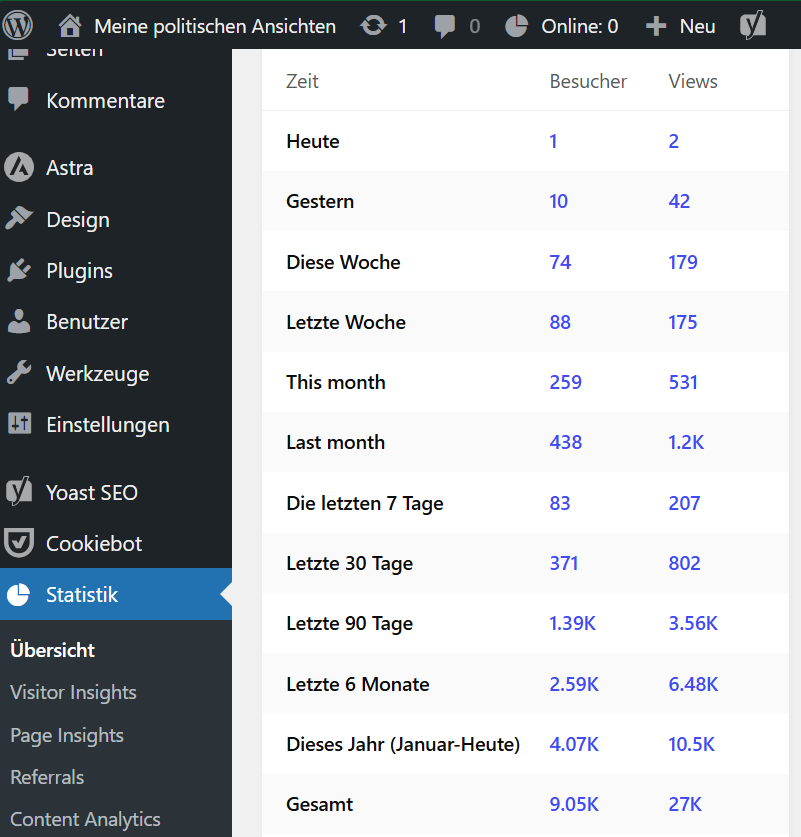 Dabei bedeutet Views, dass die Startseite aufgerufen wurde und Besucher, dass weitere Seiten besucht wurden. K steht für 1.000. Damit bin ich eine sogenannte Influencerin oder auf deutsch Einflussnehmerin.